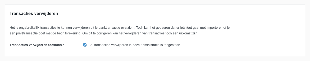 Bij de bankinstellingen in het menu "Instellingen" submenu "Bank" is het mogelijk om het verwijderen van transacties in of uit te schakelen. Na inschakeling is het verwijderen van transacties mogelijk binnen het transactie-matchproces, het transactiearchief en via de API.
