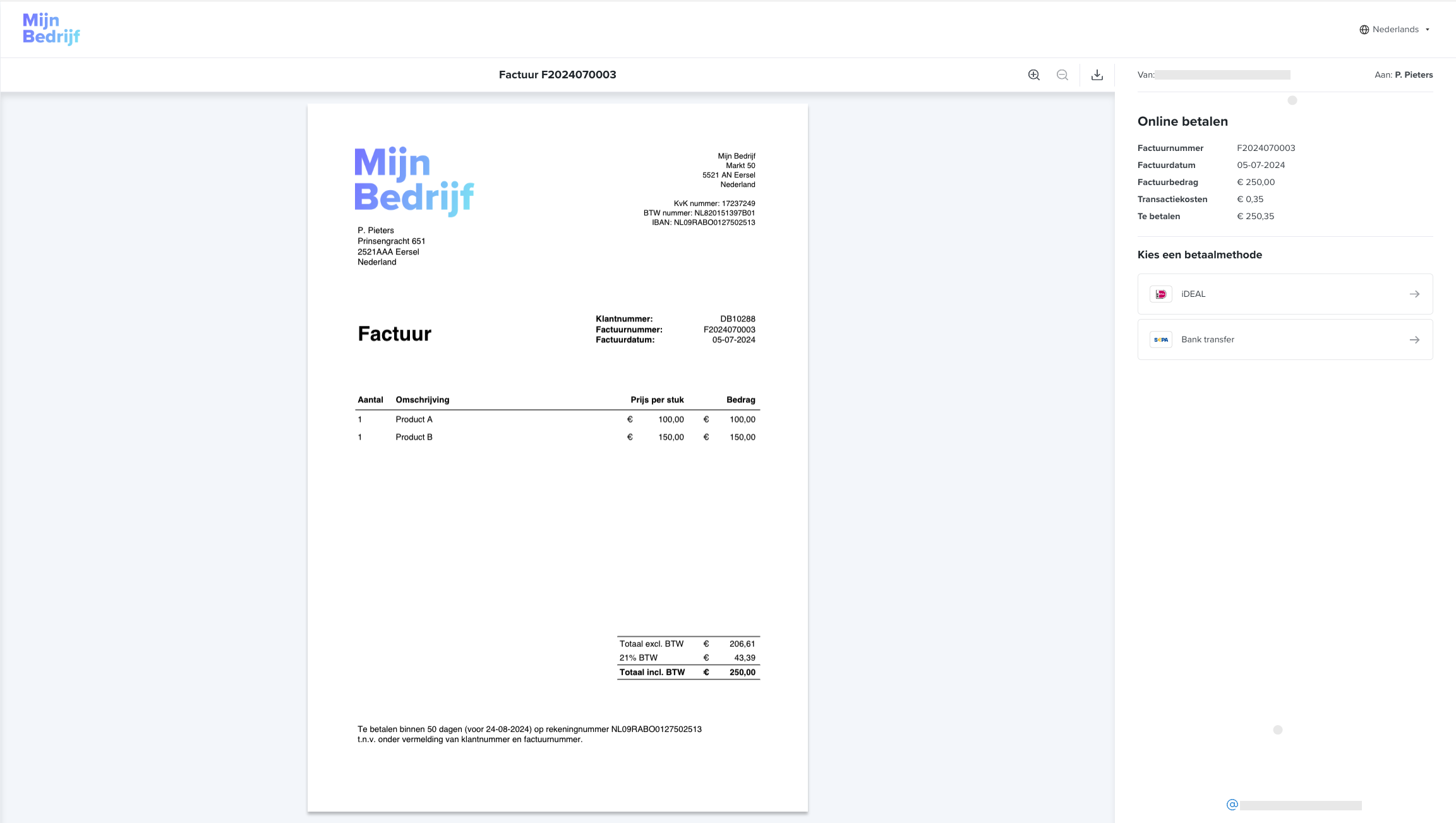 U kunt ervoor kiezen om het PDF document te tonen op het betaalscherm. Voor deze instelling navigeert u naar "Instellingen" submenu "Betaalmogelijkheden". U kunt een vinkje zetten bij "Toon factuur PDF op online betaalscherm".