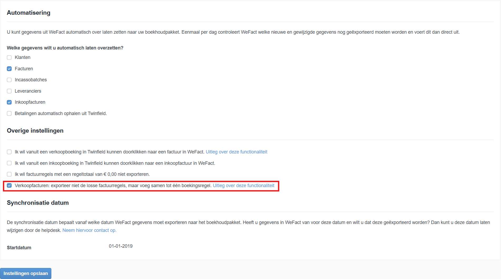 Navigeer in uw WeFact omgeving in het hoofdmenu naar “Exporteren” submenu “Boekhoudpakket”. Rechts bovenin vindt u de “boekhoudpakket opties” en de “boekhoudpakket instellingen”. Op de geopende instellingen pagina navigeert u naar “Overige instellingen”. Kies hier voor de optie:
