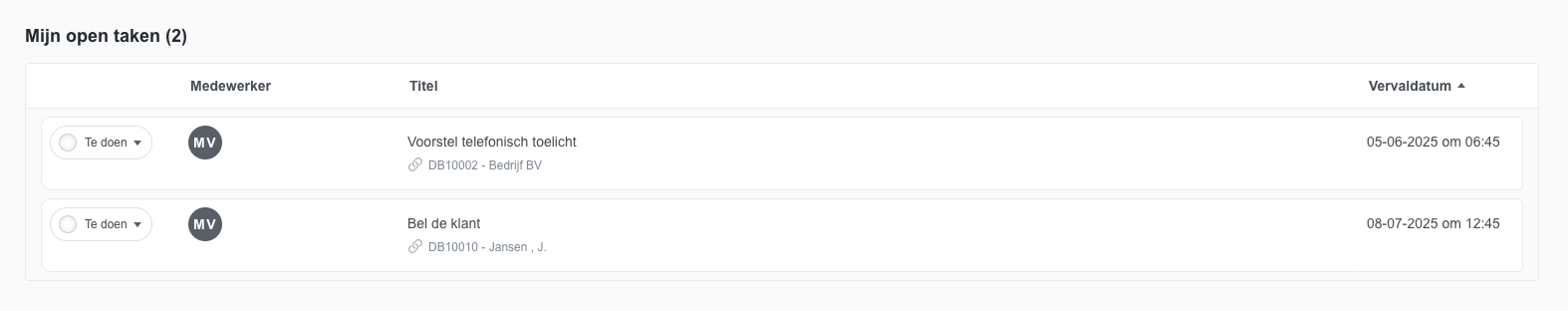 Het is mogelijk om uw open taken te raadplegen vanuit het dashboard.