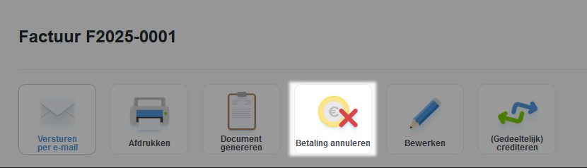 Open de betreffende factuur en klik op de knop "Betaling annuleren" bovenaan de factuur. Er verschijnt een pop-up waarin u de annulering kunt bevestigen. Na de annulering wordt de status van de factuur weer "Openstaand".