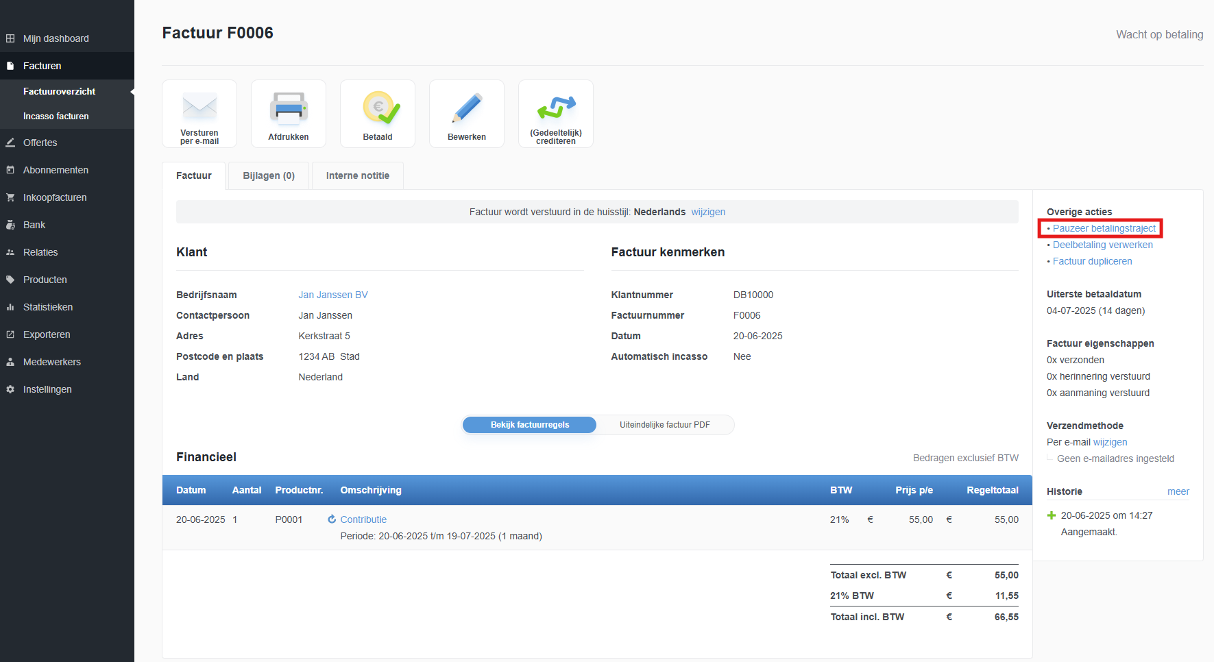 Indien u met de klant een betaalafspraak heeft gemaakt, kunt u ervoor kiezen om de klant geen herinnering te versturen. Voor deze facturen kunt u de optie "Pauzeer betalingstraject" activeren. Uziet dan geen melding meer voor het versturen van een herinnering maar u zietdat het betalingstraject is gepauzeerd.