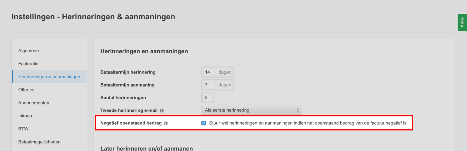 Hier kunt u de instelling "Negatief openstaand bedrag" vinden. Door een vinkje te zetten kunt u (automatisch) herinneringen of aanmaningen versturen voor facturen met een negatief openstaand bedrag.