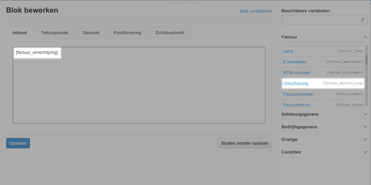 Om deze tekst ook daadwerkelijk zichtbaar te maken op de factuur PDF, dient er een variabele toegevoegd te worden in de huisstijl van de factuur. Ga hiervoor naar menuknop "Instellingen" submenu "Huisstijl" en kies onder de PDF bestanden voor "Factuur". Klik nu aan de linkerzijde onder 'Blokken toevoegen' voor "Tekstblok". Voeg hier vervolgens de variabele [factuur_omschrijving] toe die u ook in de beschikbare-variabelen-tabel kunt vinden. Het tekstblok kan nu naar wens worden gepositioneerd door deze te verslepen. Om precisie toe te passen, kunt u het tekstblok bewerken door deze aan te klikken en de instellingen in tabblad "Positionering" juist te zetten.
