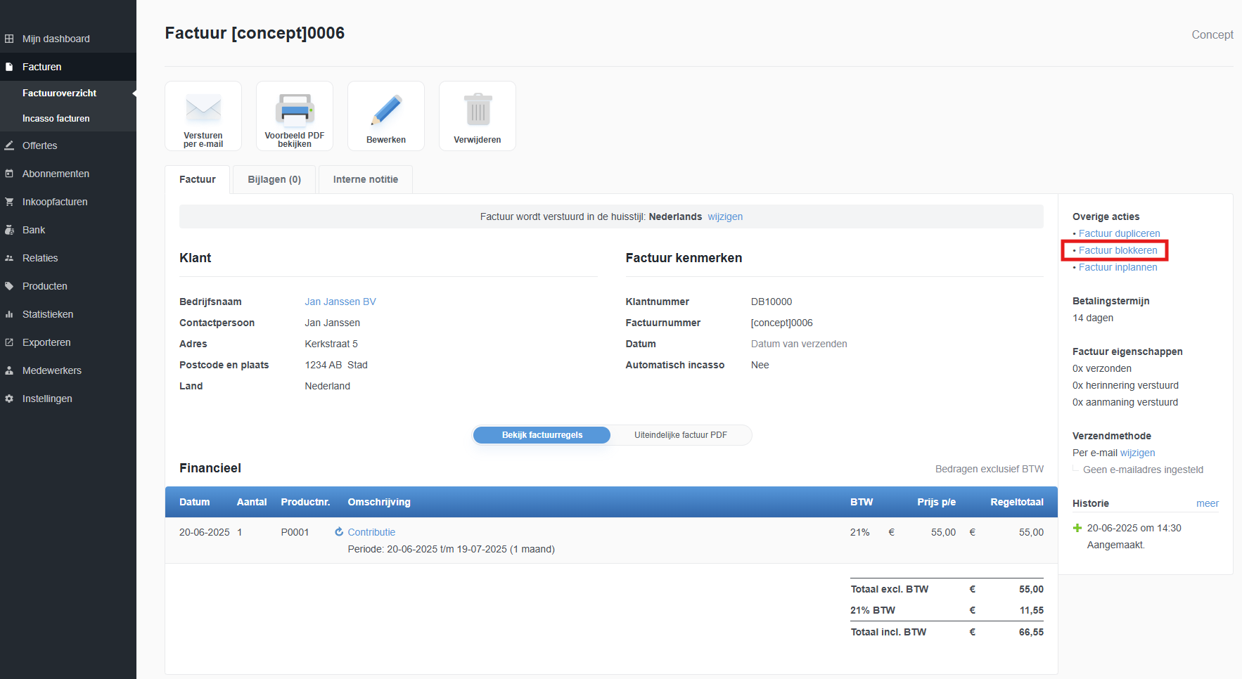Een conceptfactuur kan worden geblokkeerd om verzending te voorkomen. Tevens zal een blokkade ervoor zorgen dat er geen abonnementen aan de conceptfactuur worden toegevoegd. Heeft u de instelling om abonnementen aan een bestaande conceptfactuur toe te laten voegen op "Ja" staan, dan zal de blokkade dit dus voorkomen. Er wordt in dat geval een nieuwe conceptfactuur aangemaakt voor het abonnement.
