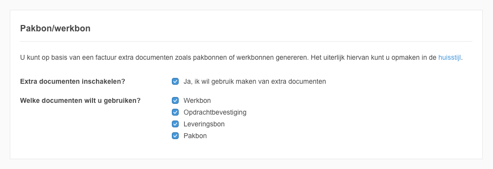 Standaard staat deze functionaliteit uitgeschakeld. Om het in te schakelen gaat u in het menu naar "Instellingen". Op de geopende pagina gaat u naar het onderdeel "Facturatie" en vindt u onderaan het blok "Pakbon/werkbon". Hier kunt u de functionaliteit inschakelen door een vinkje te zetten. U kunt één of meerdere documenten aanvinken en tegelijkertijd gebruiken.