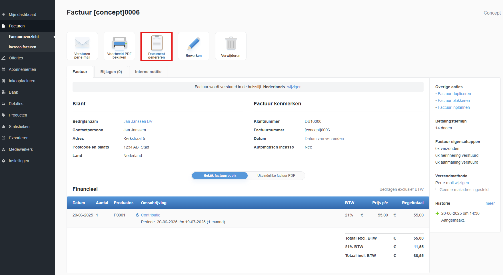 Het genereren gebeurt op basis van een (concept)factuur. Na een factuur maken of bekijken, vindt u bovenaan een grote actieknop "Document genereren", of indien u maar 1 documenttype actief heeft deze naam van dit documenttype. Wanneer u hier op klikt heeft u de keuze het document te genereren of per e-mail te versturen, bijvoorbeeld een pakbon maken. Per e-mail kunt u het bericht altijd nog personaliseren.