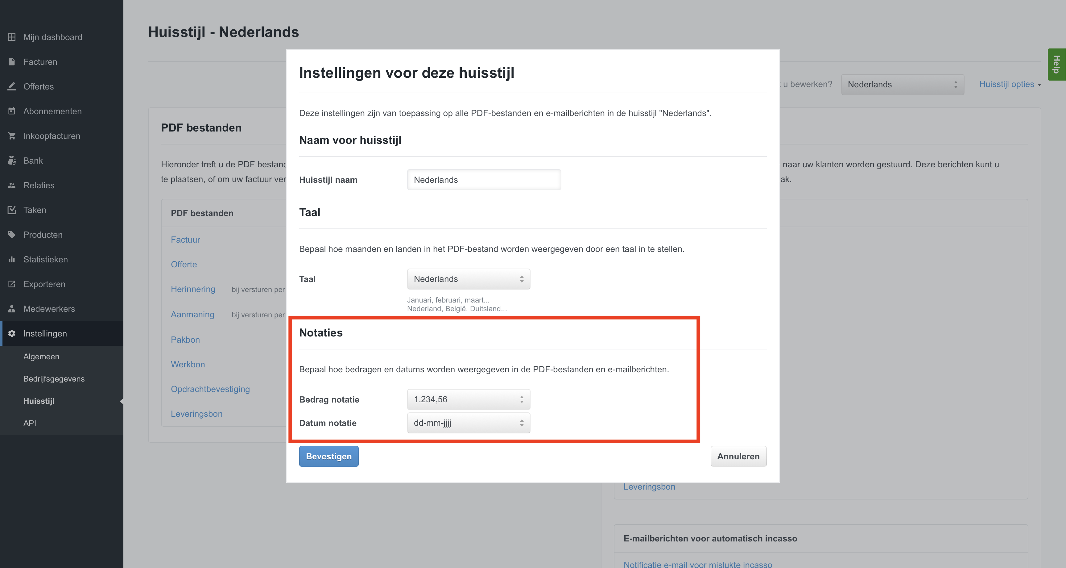 Het is in WeFact mogelijk de notatie van data en bedragen op huisstijl niveau in te stellen.