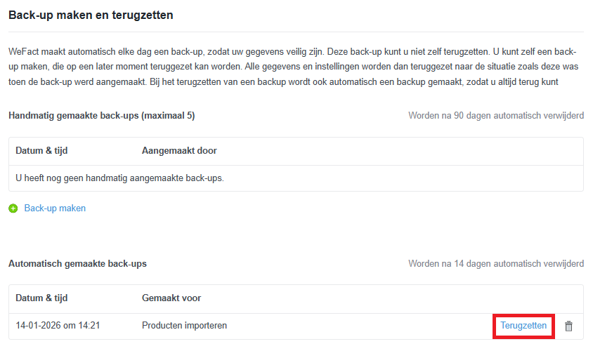 Is er tijdens het importeren iets misgegaan en zijn de producten niet correct geïmporteerd? Dan kunt u de administratie eenvoudig terugzetten naar het moment vóór de import en de import opnieuw uitvoeren. Op het moment dat u een import start, maakt WeFact namelijk automatisch een back-up van uw administratie.