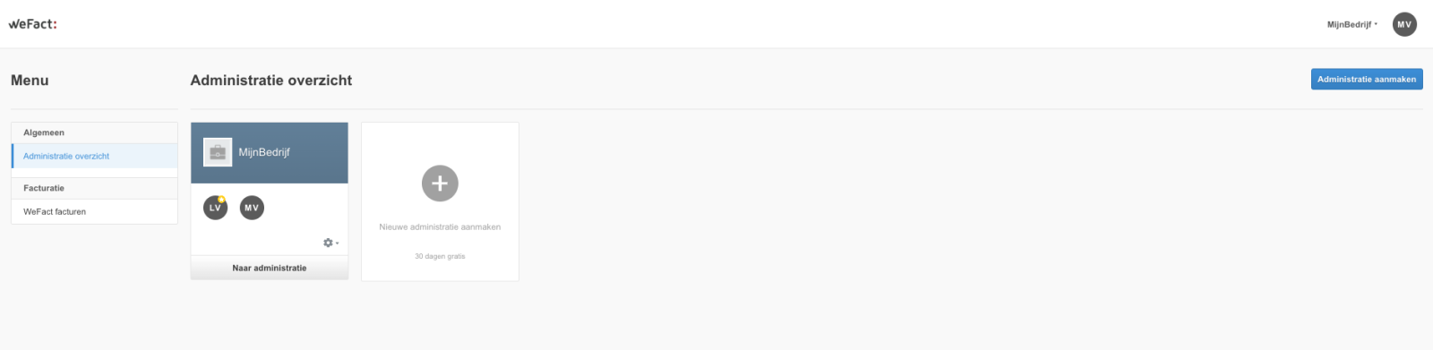 Ga binnen de WeFact administratie rechtsbovenin naar het administratie overzicht, als u nog niet in het administratie overzicht zit. In het administratie overzicht ziet u uw administratie(s).