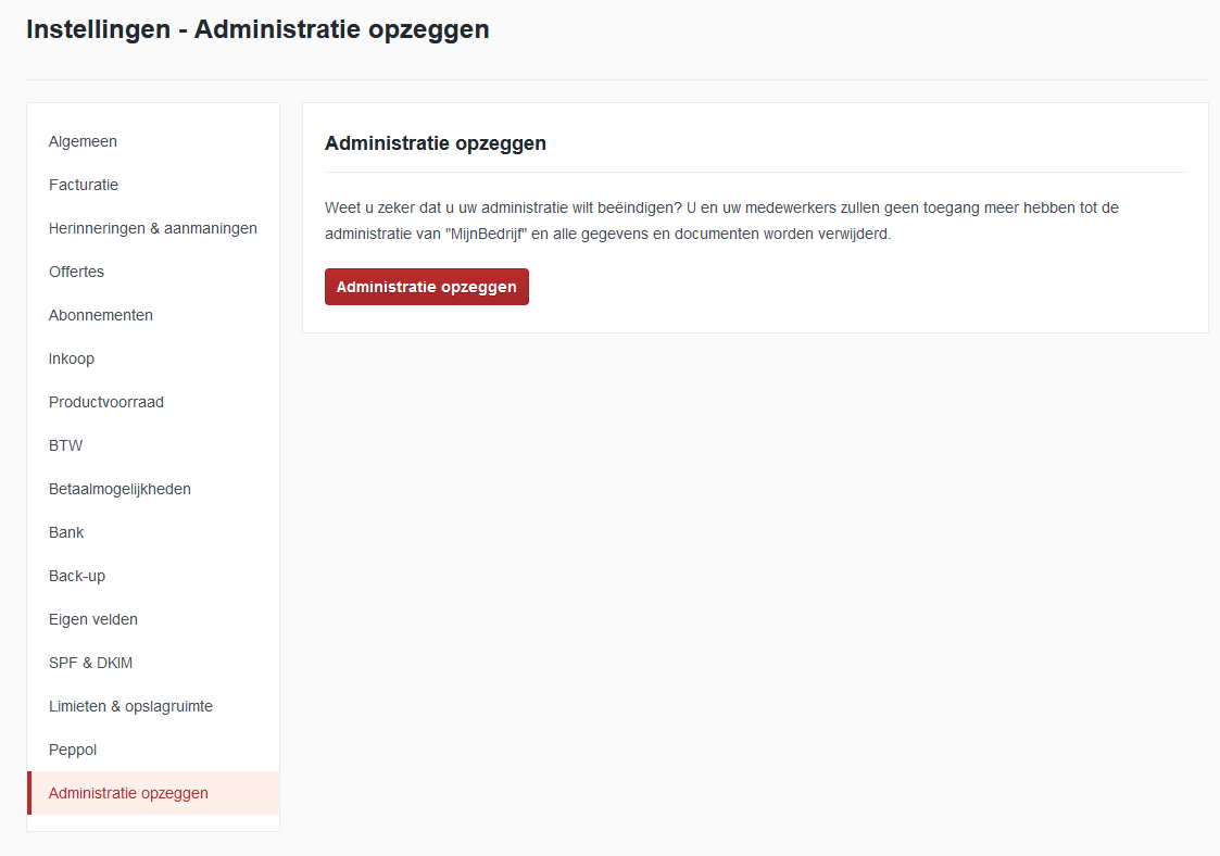 Navigeer in het menu naar "Instellingen" submenu "Algemeen". Kies in het witte menu voor "Administratie opzeggen" en klik op de pagina die verschijnt op de gelijknamige knop "Administratie opzeggen". Vervolgens zal er een venster verschijnen waarin u kunt aangeven per wanneer u de opzegging wilt doen.
