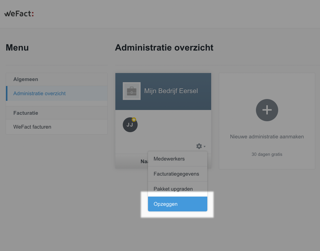 Een opzegging van uw WeFact administratie dient u via uw eigen omgeving aan ons door te geven. Er zijn twee plekken in uw WeFact administratie waar u deze actie kunt doorvoeren.